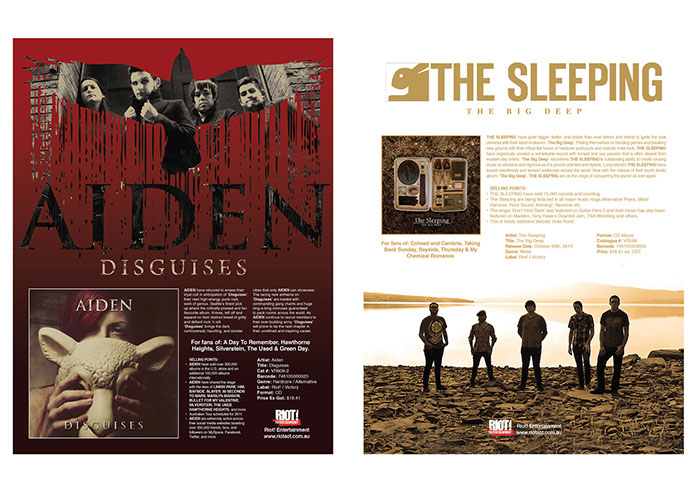 This was really fun work. Onesheets are information pages sent to record stores, radio stations and various publications to inform them of up coming album launches from both international and local bands that Riot! represented throughout Australasia. Liaising with Riot! Entertainment’s owner and their head PR representative, each page was tailored and designed with images from the record labels directly.